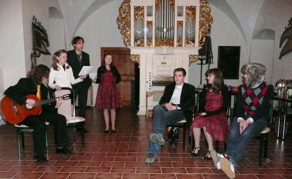 Der späte Abend gehört dem Ball. Bei Tanzmusik, einem üppigen Buffet und einigen lustiges Spielen kommt Stimmung auf. Das unterhaltsame JA-Schauspiel stellt uns auf originelle Weise die mysteriöse „Selbsthilfegruppe“ vor. Direkt danach wird ein Lied für die Verantwortlichen gesungen und sie bekommen alle ein Marzipanschweinchen. Hilfe, es ist ja schon fast 12! Eilig gießen wir Champagner in die Gläser und stoßen an. Auf uns, auf die tschechische EU-Ratspräsidentschaft, auf die Junge Aktion, auf die deutsch-tschechische Freundschaft, auf ein gutes 2009! Und nicht zuletzt auf die Euroeinführung in der Slowakei.