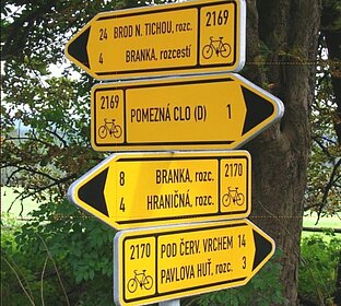 Nachdem uns am nächsten Morgen die Sonnenstrahlen wach gekitzelt hatten, nahmen wir ein fürstliches Frühstück im "Konferenzsaal" ein. Anschließend gab uns Matěj eine Einführung über die bewegte deutsch-tschechische Geschichte des Tachauer Kreises und Ondrej stellte in einer Videoschau die Ausstellung "Das verschwundene Sudetenland" vor. Sie zeigte in Fotopaaren die Veränderungen der Landschaft der ehemals deutsch besiedelten Gebiete in den letzten 80 Jahren und war Inspiration für unsere Spurensuche. Danach machten wir uns gleich mit dem Fahrrad in die Wildnis auf, um selbst viele der Ortschaften zu erkunden. Nach etlichen Kilometern teils unwegsamen Geländes blieben wir plötzlich auf einem Feldweg stehen und erfuhren, dass wir uns mitten in Wosant/Bažantov befanden. Bessergesagt in dem was davon noch übrig geblieben war. Nichts außer ein Wegekreuz deutete mehr darauf hin, dass hier im Jahre 1939 einmal ein Dorf mit etwa 60 Häuser stand. Wir mussten uns schon tief ins Dickicht des Waldes vorkämpfen, um verfallene Mauerreste und einen alten Brunnen zu finden, der einst einen künstlich angelegten Dorfweiher mit Wasser versorgte. Nur wenige Bruchstücke konnten sich der Naturgewalt und den militärischen Zielübungen widersetzen. Einen ähnlichen Anblick bot uns die baufällige St. Anna Kirche mit ihrem Friedhof unweit von Wosant und die ehemalige Ortschaft Purschau.